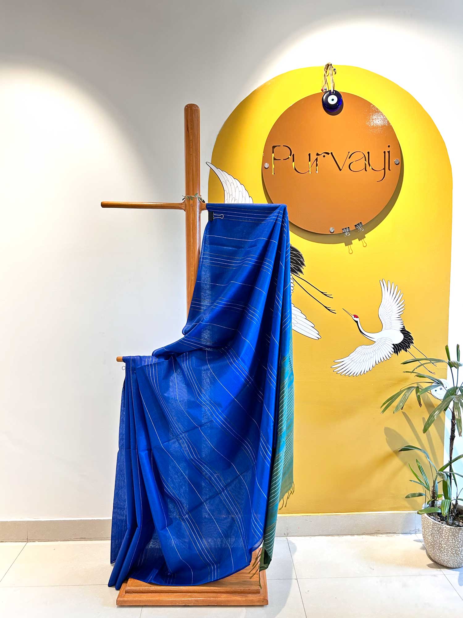 Bright Blue Saree with Threadwork and Contrast Bottle Green Pallu - Silk Cotton